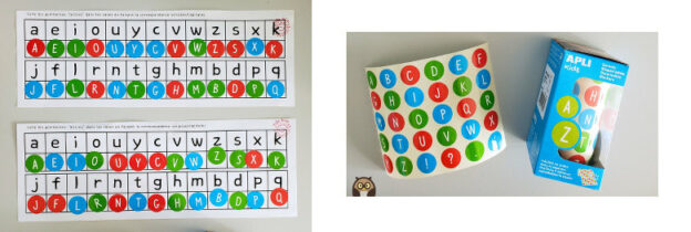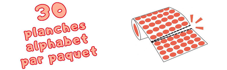 La marque Apli Kids fabrique des gommettes lettres bien pratiques, qui permettent de travailler la reconnaissance des lettres de façon motivante pour les élèves. Chaque rouleau de gommettes contient 30 feuilles prédécoupées avec 26 gommettes lettres dans l’ordre de l’alphabet (les lettres sont blanches, sur un fond vert, bleu ou rouge ; il y a plusieurs assortiments de couleurs selon les planches).