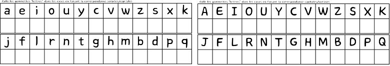 J’ai prévu trois fiches (2 par A4) pour coller des gommettes en capitales ou en cursives, dans des tableaux en scriptes ou en capitales : on peut donc s’en servir pour faire une correspondance capitales/capitales, scriptes/capitales ou cursives/capitales.