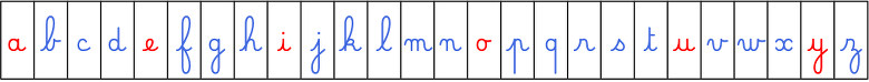 Edit 2026 : Je rajoute une V2 avec un autre alphabet en script (pour les a et les g) pour les réglettes « 3 graphies » ; ainsi que des réglettes individuelles avec un seul alphabet horizontal.